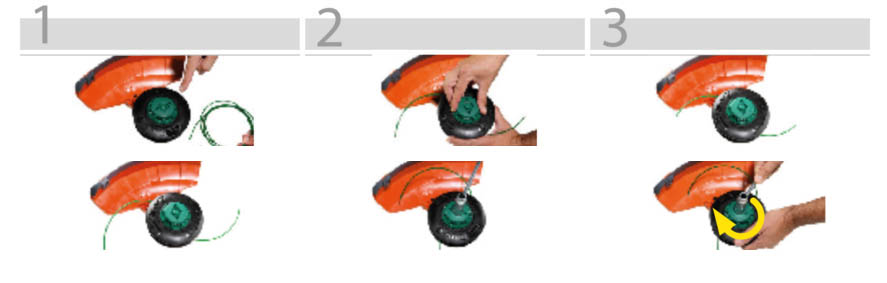 Совместите стрелки на корпусе с стрелками на кнопке. Вставьте леску в триммерную голову, через одно отверстие и подайте его через противоположное, пока не получите два хвоста одинаковой длины.